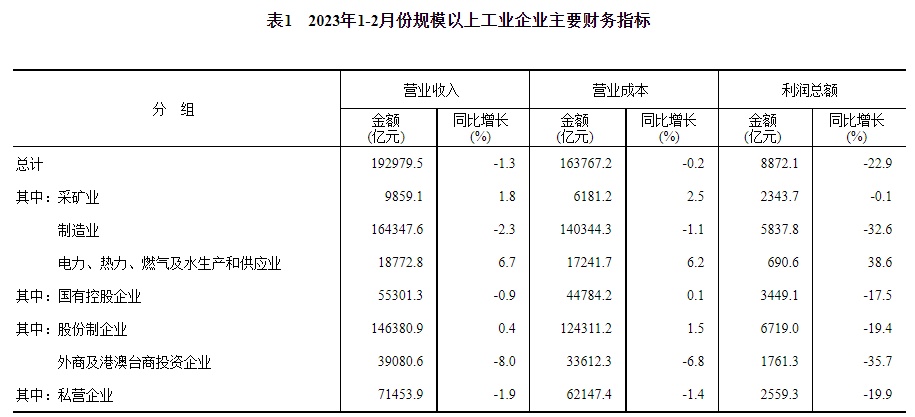 2023年1—2月份全国规模以上工业企业利润下降22.9%