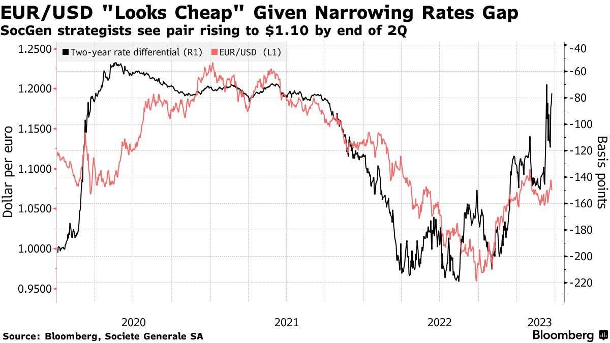欧元兑美元“看起来很便宜”;鉴于利差收窄,法兴银行策略师认为,欧元兑美元将在第二季度末升至1.10