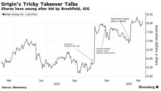 这家总部位于悉尼的能源生产商和零售商计划于周一与布鲁克菲尔德及其风险投资伙伴EIG Global energy Partners的MidOcean energy达成最终协议,该协议将在未来几天内宣布。据知情人士透露,该协议将以每股8.90澳元的指示性报价对其股票进行估值。而EIG、Brookfield 和 Origin 的代表拒绝置评。