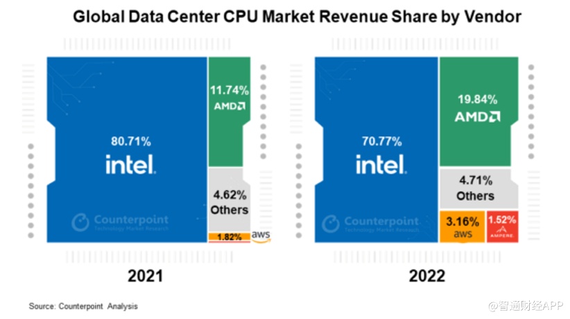Counterpoint Research估计,2022年AMD在数据中心CPU市场的份额略低于20%,高于2021年的近12%。更重要的是,英特尔仍然控制着70%的市场份额,为AMD提供了一条轻松的营收增长道路。