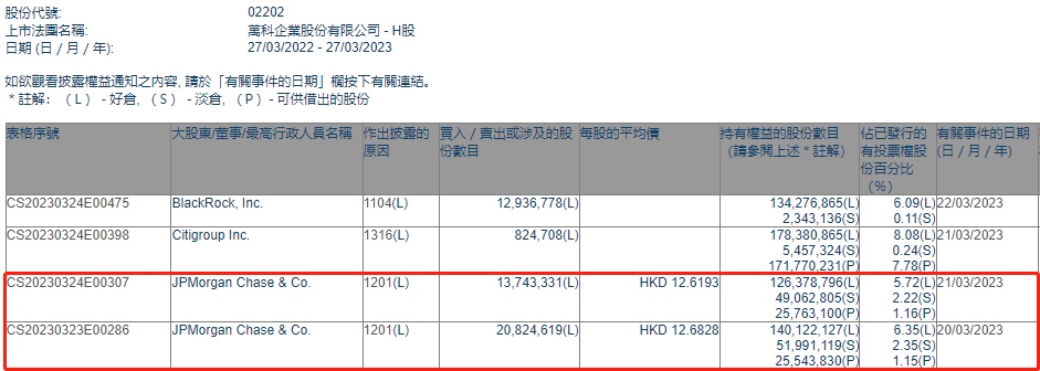 智通财经APP获悉,香港联交所最新资料显示,3月20、21日,小摩分别减持万科企业(02202)2082.4619万股、1374.3331万股,合计3456.795万股,每股作价分别为12.6828港元、12.6193港元,总金额约为4.38亿港元。减持后最新持股数目约为1.26亿股,最新持股比例为5.72%。