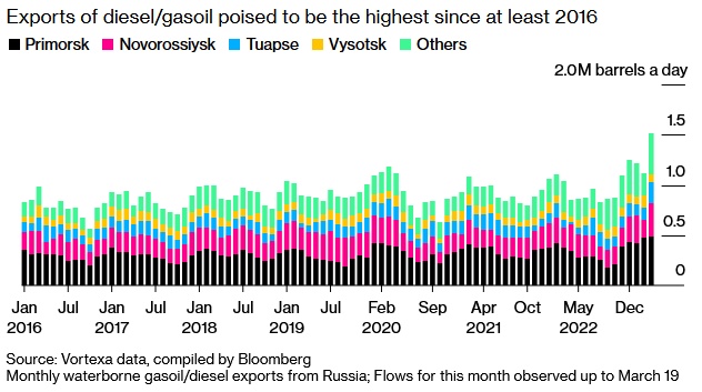 美国独立石油产品分析师Mikhail Turukalov表示,3月份迄今为止,俄罗斯炼油厂仍然以较高产能运营,这使得柴油产量强劲。他指出,俄罗斯国内的生产商似乎对能够把生产出来的柴油卖给外国买家相当自信,因为他们提供的折扣足够大,而且这种燃料还有新的市场。
