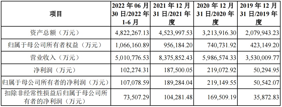 财务方面,于2019年度、2020年度、2021年度以及2022年6月30日止,公司实现营业收入分别约为353亿元、598.66亿元、837.59亿元、501.08亿元。其中,公司实现净利润分别约为5.03亿元、21.91亿元、18.75亿元、10.23亿元。