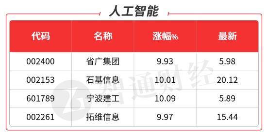 抖音大模型展开补涨,进一步提振人工智能板块整体强度,线上线下(300959.SZ)20cm涨停,川大智胜(002253.SZ)6天3板,首板有省广集团(002400.SZ)。