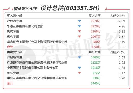 设计总院(603357.SH):多主力现身龙虎榜,3家机构席位合计净买入3264万元,沪股通对倒买入5681万元,买二是量化基金的席位买入2720万元,当日净买入9560万元,该股今日放量涨停,突破前期高点需放量。