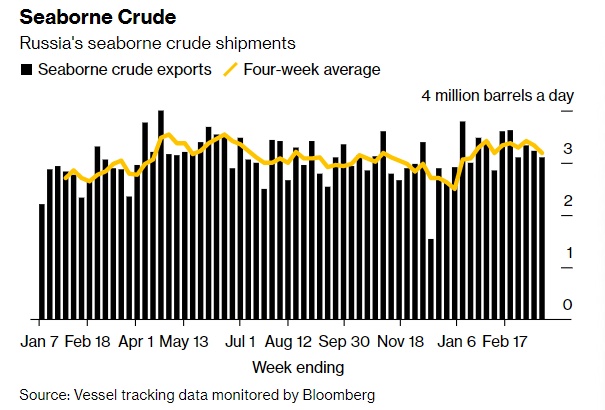 作为对西方国家制裁措施的回应,俄罗斯承诺从3月到6月将每日减产50万桶石油。这一减产计划尚未体现在货运数据中。自减产消息公布以来,油价大幅下跌,表明交易员对减产威胁并未感到焦虑。