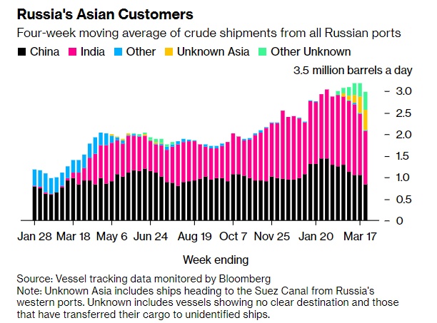 数据显示,在截至3月24日的四周里,俄罗斯流向亚洲的石油日出货量从此前的318万桶降至299万桶,为五周以来首次低于300万桶。