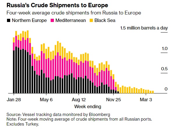 在截至3月24日的四周内,没有俄罗斯原油被运往北欧国家。