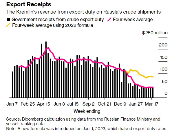 在截至3月24日的七天里,俄罗斯从原油出口关税中获得的收入减少了200万美元至4200万美元,而四周的平均收入维持在4300万美元不变。