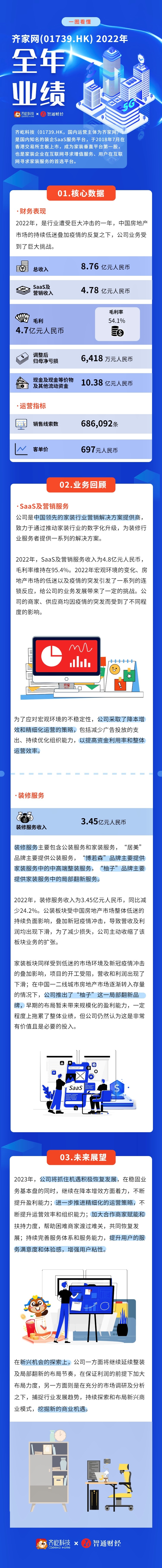 智通财经APP获悉,3月27日,齐屹科技(01739)披露2022年全年业绩。报告期内,公司录得总收入8.76亿元,实现毛利4.7亿元。齐屹科技致力于通过推动家装行业的数字化升级,为装修行业服务者提供一系列的解决方案。2022年,SaaS及营销服务收入为4.8亿元,毛利率维持在95.4%。