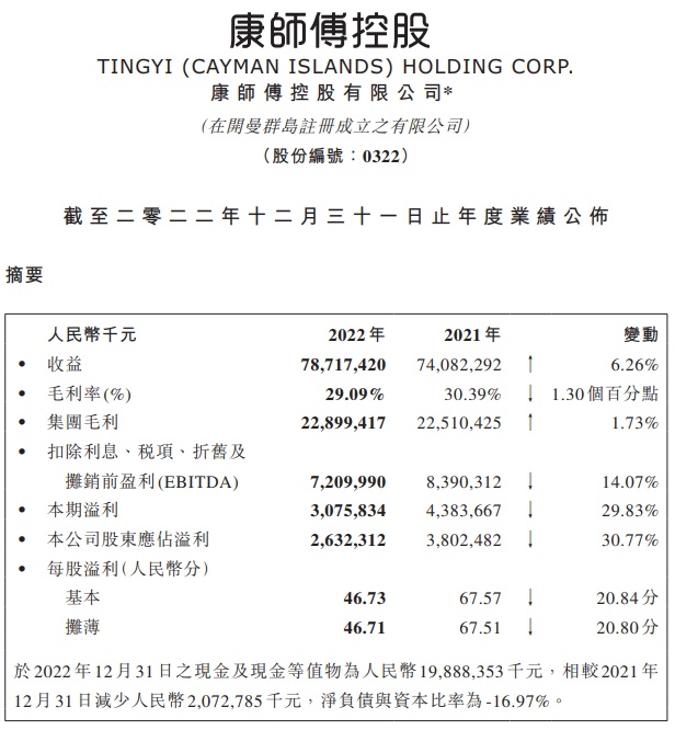 智通财经APP获悉,3月27日,康师傅控股(00322)公布了2022年的年度业绩。2022年,康师傅实现营业收入787.17亿元,同比增长6.26%;净利润为26.32亿元,同比下跌30.77%;毛利率为29.09%,同比下降1.3%。公司表示,由于原材料价格上涨及组合变化,方便面业务、饮品业务的毛利率大幅下滑。二级市场方面,康师傅早盘一度跌超13%,现跌11.71%,报12.52港元。