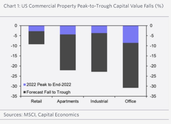 凯投宏观表示,商业地产市场包括工业和零售地产,以及写字楼和公寓。在Shearing看来,由于本月早些时候硅谷银行倒闭,小型银行的存款基础面临压力,商业地产贷款可能会收紧。