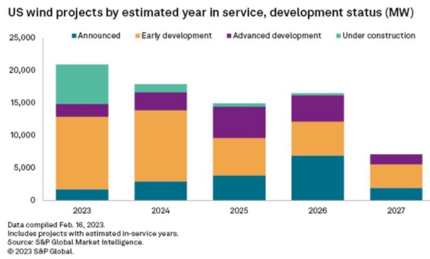标普表示,陆上风电活动的下降主要是生产税收抵免下降的结果,去年开始建设的项目取消了这一税收抵免。但去年8月签署的《通胀削减法案》恢复了税收抵免的价值,标普认为这将在未来几年推动风电场建设。