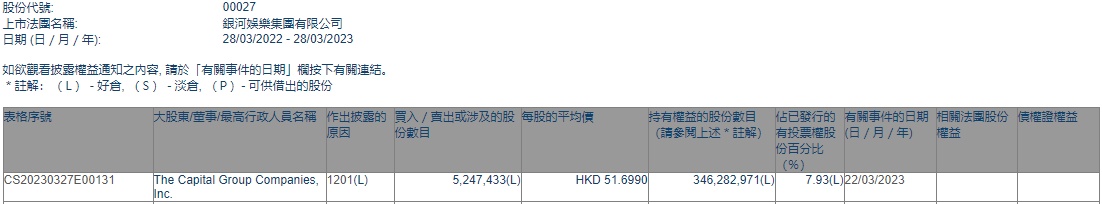 Companies减持银河娱乐(00027)524.7433万股,每股作价51.699港元,总金额约为2.71亿港元。减持后最新持股数目约为3.46亿股,最新持股比例为7.93%。