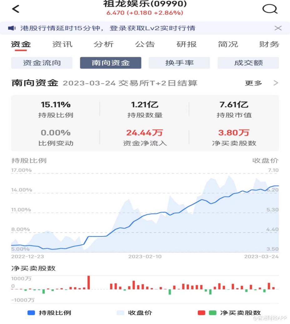 智通财经APP注意到,2022年下半年以来,各路资金通过买入股票的方式对祖龙娱乐投来“信任票”。截至3月24日止的近60个交易日,祖龙娱乐获得2.4亿港元净流入。此外,南向资金年初以来持续增持公司股份,截至3月24日(交易所T+2结算)持股数量达到1.21亿股,持股比例15.11%,持股市值7.61亿港元。