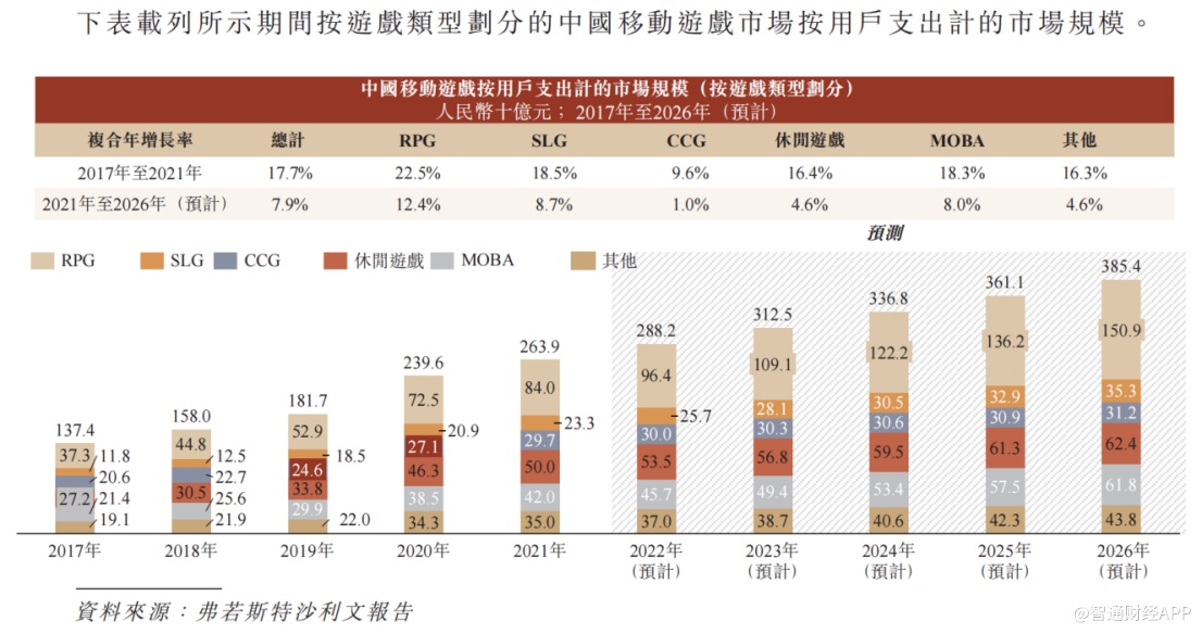 以中国市场为例,根据弗若斯特沙利文报告,中国游戏行业高速增长,中国内地已成为全球最大游戏市场,按用户支出计的市场规模(下同),预计在2026年将达到3854亿元,2021年至2026年的年均复合增速为7.9%。