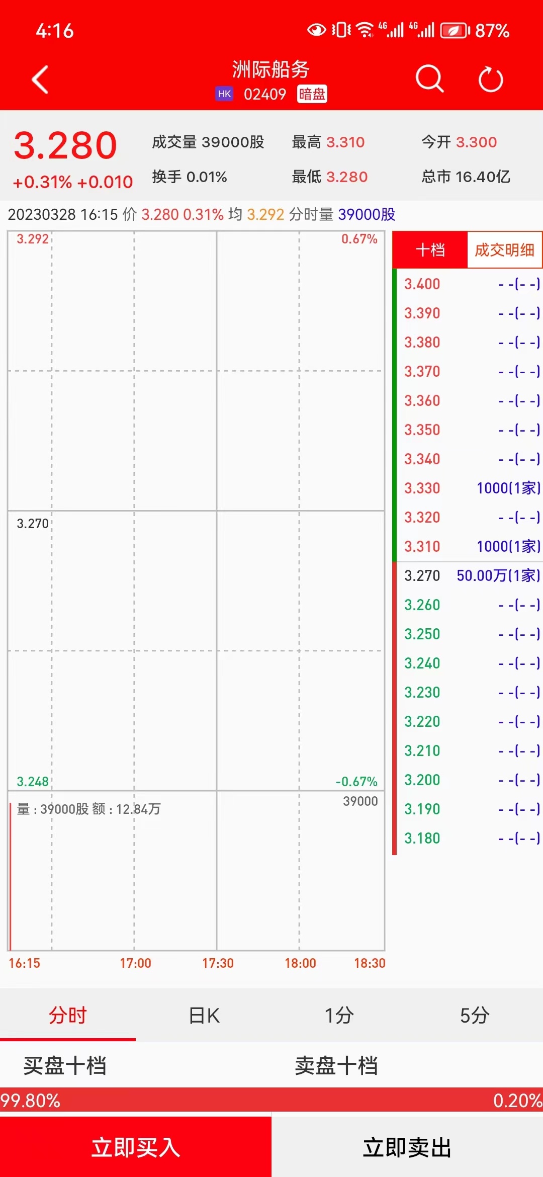 智通财经APP获悉,洲际船务(02409)将于3月29日(周三)在香港挂牌。截至发稿,利弗莫尔证券暗盘交易显示报价3.28港元,较招股价3.27港元涨0.31%。每手1000股,不计手续费,每手赚10港元。