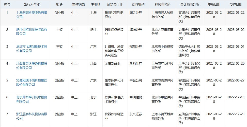 智通财经APP获悉,3月28日,沥高科技、伯特利、飞速创新、艾芬达、筠诚和瑞、开科唯识、晨泰科技共7家申请创业板IPO审核状态变更为“中止”。