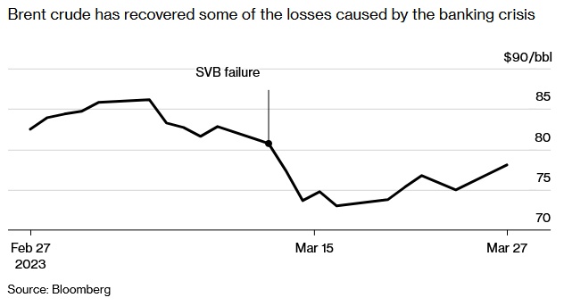 油价在上周一度跌至15个月以来低点,原因是人们担心以硅谷银行倒闭、瑞信被收购为中心的银行业危机对经济造成的影响将损害石油需求。不过,在这之后,油价有所回升,这缓解了OPEC+提振油市的压力。