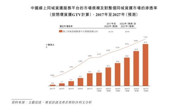 随着互联网技术对传统行业以及生产生活的渗透,物流行业的数字化变革时机已经成熟,并给货拉拉这样的互联网物流平台带来巨大的市场机会。据弗若斯特沙利文的资料,中国是全球最大的公路货运市场,并预计2022年至2027年将以7.6%的年复合增长率稳步增长。货拉拉核心业务所处的中国同城货运市场也有着广阔的发展前景。根据弗若斯特沙利文的资料,2022年该市场GTV为2132亿美元,并预计2022年至2027年将以12.1%的复合年增长率进一步增长;同时中国同城货运市场的线上渗透率仍处于较低水平,线上渗透率预计将由2021年的4%提升至2027 年的7.3% 。