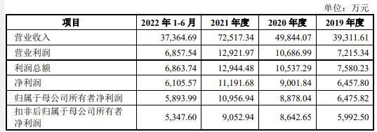 财务方面,2019年度、2020年度、2021年度及2021年1-6月,公司实现营业收入分别约为3.93亿元、4.98亿元、7.25亿元及3.74亿元人民币;同期,净利润分别约为6457.80万元、9001.84万元、1.12亿元及6105.57万元。
