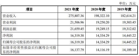 财务方面,于2019年度、2020年度及2021年度,公司实现营业收入分别约为18.26亿元、19.83亿元及27.58亿元人民币;净利润分别约为1.44亿元、1.43亿元及1.63亿元人民币。