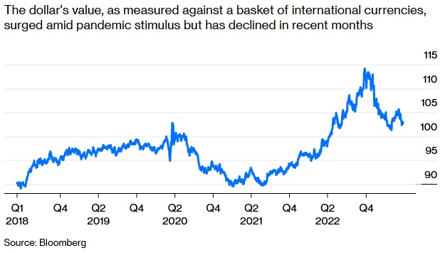 智通财经APP获悉,衡量美元兑六种主要货币(欧元、瑞士法郎、日元、加拿大元、英镑和瑞典克朗)汇率的美元指数(DXY)在去年9月一度升至114上方,而目前则徘徊在102附近。