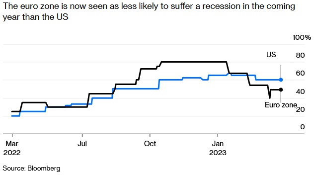 目前看来,欧元区经济在未来一年遭受衰退的可能性低于美国