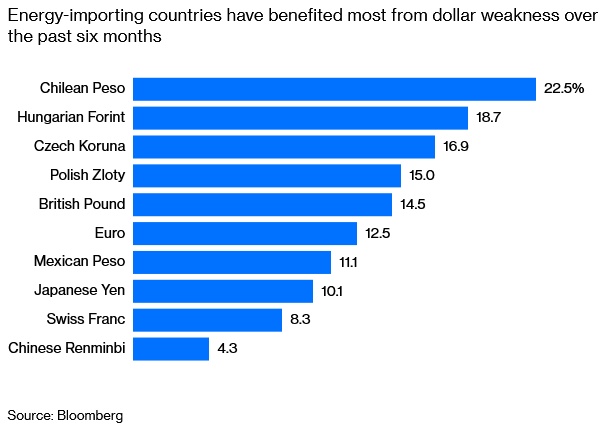 从美元走软中获益最大的是东欧和南美。智利比索上涨了22.5%。另外,大多数能源进口国的货币也有所升值,因为全球多数大宗商品均以美元计价,而美元走弱给这些国家带来了喘息之机。