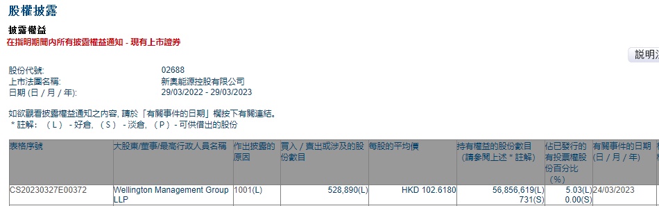 LLP增持新奥能源(02688)52.889万股,每股作价102.618港元,总金额约为5427.36万港元。增持后最新持股数目约为5685.66万股,最新持股比例为5.03%。