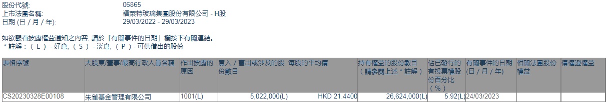 智通财经APP获悉,香港联交所最新资料显示,3月24日,朱雀基金增持福莱特玻璃(06865)502.2万股,每股作价21.44港元,总金额约为1.08亿港元。增持后最新持股数目为2662.4万股,最新持股比例为5.92%。
