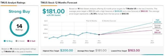 根据这一立场,Flannery给予T-Mobile“增持”评级,目标价为175美元。根据Tipranks的数据,在14给出评级的分析师中,近期共有12位分析师给出“买入”评级,没有分析师给出“卖出”评级,因此联合健康获得了“强烈买入”共识评级。同时,分析师给予该股的平均目标价为181美元。