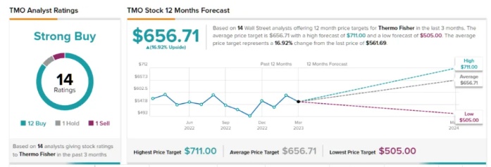 因此,Savant给予赛默飞世尔“增持”评级,并给予目标价670美元。根据Tipranks的数据,在14给出评级的分析师中,近期共有12位分析师给出“买入”评级,仅1位分析师给出“卖出”评级,因此赛默飞世尔获得了“强烈买入”共识评级。同时,分析师给予该股的平均目标价为656.71美元。