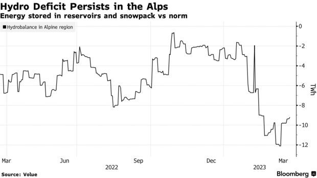 去年,莱恩河因干旱天气水位过低阻碍煤炭、石油等各种产品的运输的画面还历历在目,创纪录的高温天气也限制了水力发电和核能生产。气候变化使恶劣天气事件更有可能发生。阿尔卑斯山的水文平衡,即水库和积雪中储存的能量与季节性标准相比,已经出现了自2017年以来的最大赤字。炎热的天气可能会增加对电力的需求,且如果莱茵河再次出现水位下降的情况,可能会扰乱煤炭和石油等产品往德国的运输。