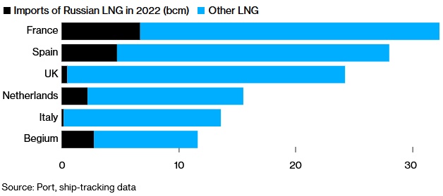 西班牙是欧洲最大的俄罗斯液化天然气买家之一,它直接敦促企业减少购买,但全面禁止将难以实现。Energy Aspects Ltd.分析师Leo Kabouche指出,俄罗斯液化天然气占去年欧洲液化天然气进口总量的14%,如果禁止进口俄罗斯液化天然气,损失将是“巨大的、且极具挑战性的”。
