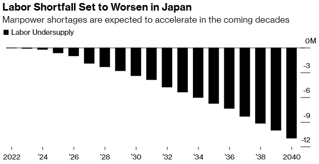 智通财经APP获悉,一项研究发现,到2040年,日本可能会面临超过1100万的劳动力短缺,这突显出随着人口快速老龄化,日本面临的经济挑战。独立智库Recruit Works Institute周二发布的这项研究显示,预计从2027年起,日本劳动年龄人口将迅速下降。报告称,尽管劳动力需求保持稳定,但日本2040年的劳动力供应预计将比2022年减少约12%。报告称,拥有1.26亿人口的日本已经开始感受到压力,预计到2040年,适龄劳动人口将比2020年减少20%,至5980万。