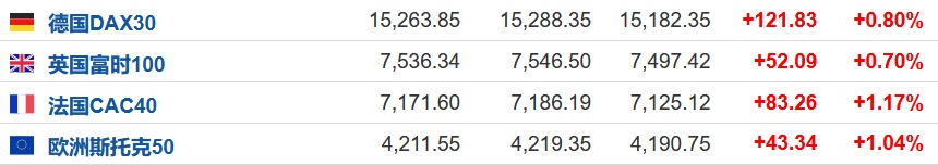 2.截至发稿,德国DAX指数涨0.80%,英国富时100指数涨0.70%,法国CAC40指数涨1.17%,欧洲斯托克50指数涨1.04%。