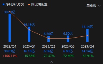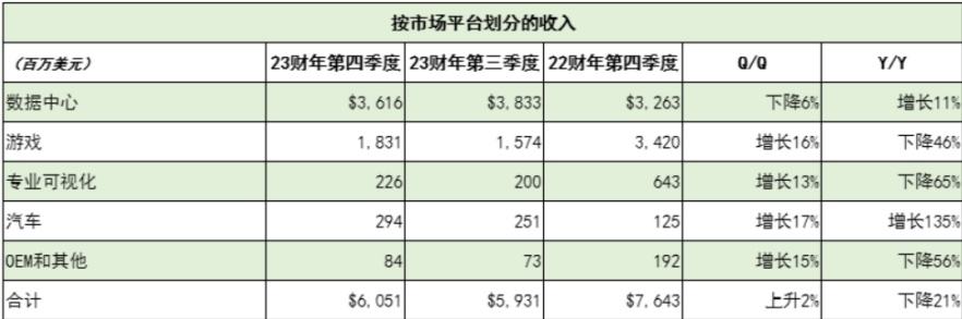 2月22日美股盘后,英伟达发布截至1月29日的2023财年四季度财报及全年业绩报告。财报显示,该公司2023财年四季度营收60.51亿美元,同比下滑21%;净利润14.14亿美元,同比下滑53%。