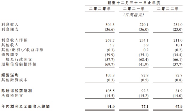 财务方面,于2020年、2021年及2022年,公司分别实现利息收入3.04亿元(港元,下同)、2.70亿元及2.34亿元;同期,年内盈利9100万元,7710万元及6790万元。