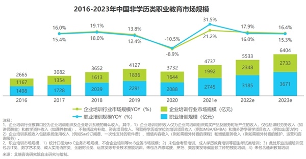 除多重政策利好密集释放之外,职业教育市场规模正快速扩大,行业仍拥有很高的天花板。据艾瑞咨询预计,在全球职业教育发展宏观背景向好的大环境下,2022年全球职业教育市场规模将达到6840亿美元,并在2026年超过8000亿美元。而具体到中国职业教育市场,据德勤研究预计,2023年中国职业教育市场规模将突破9000亿元。