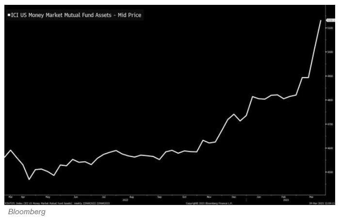 智通财经APP获悉,最近几周,由于银行业风波和美联储加息等不确定因素的影响,货币基金不断吸入大量资金,成为众多投资者最安全、风险最低的投资选择之一。根据共同基金数据,截至上周的一个月,美国货币基金管理的资产规模飙升约3120亿美元,达到创纪录的5.132万亿美元。