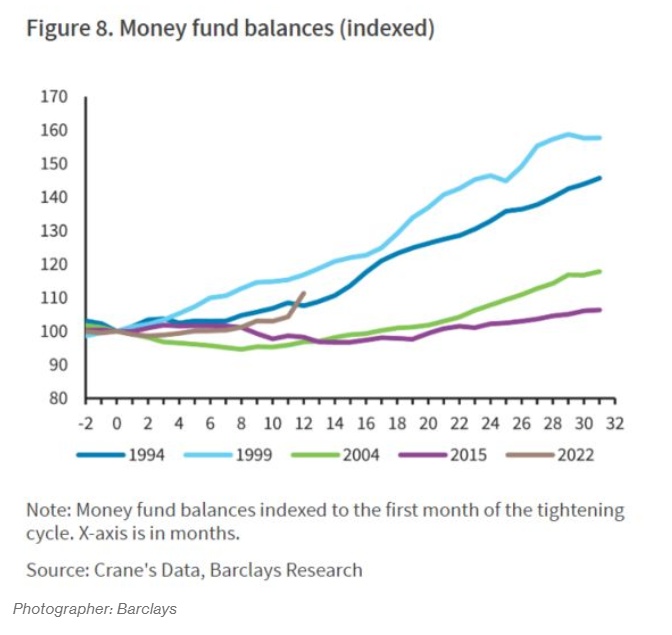 “不管到目前为止储户继续持有低收益存款的确切原因是什么,我们都认为,储户刚刚意识到他们有能力在潜在风险较低的货币市场基金中赚取更多收益。毕竟,与银行不同,货币基金的资产是非常短期的,因此在美联储紧缩周期中,它们面临的利率风险要小得多。”