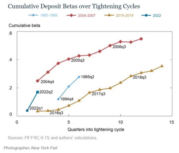 纽约联储去年11月的一项研究表明,最近几个周期都是如此。周期进入得越深,银行存款利率就越会跟随联邦基金利率。