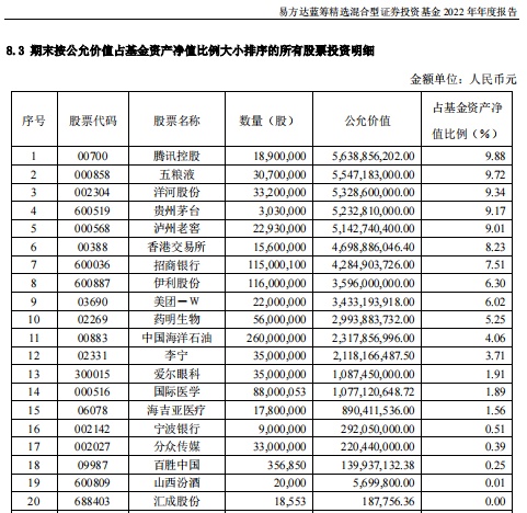 持仓方面,易方达蓝筹精选期末前十大重仓股依然没有任何改变,仍然是腾讯控股(00700)、五粮液(000858.SZ)、洋河股份(002304.SZ)、贵州茅台(600519.SH)、泸州老窖(000568.SZ)、香港交易所(00388)、招商银行(600036.SH)、伊利股份(600887.SH)、美团(03690)和药明生物(02269)。