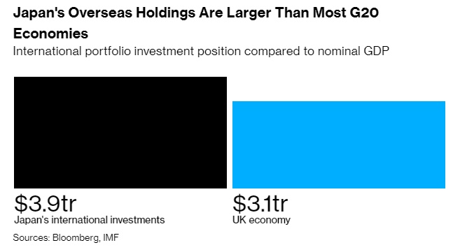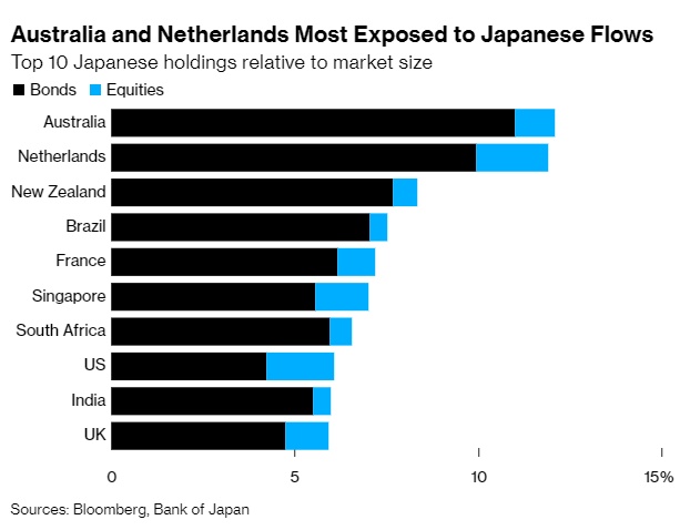 这一资金转移的规模是如此巨大,以至于日本投资者成为美国以外最大的美国国债持有者,以及约10%的澳大利亚国债和荷兰债券的持有者。据统计,他们还持有8%的新西兰证券和7%的巴西债务。