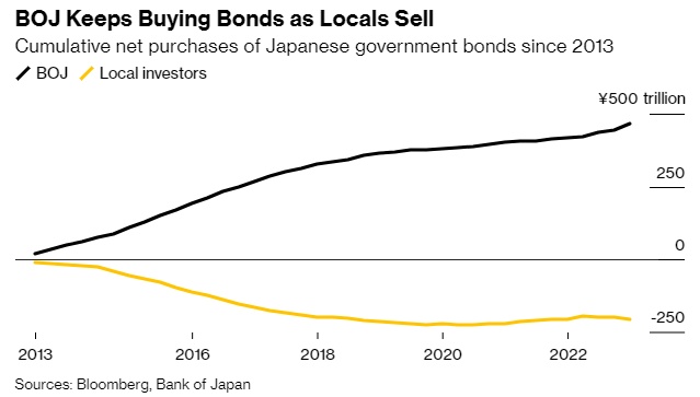根据日本央行的数据,自黑田东彦10年前实施量化宽松政策以来,日本央行已购买了465万亿日元(约合3.55万亿美元)的日本政府债券,这压低了债券收益率,并加剧了主权债务市场前所未有的扭曲。结果,日本本土基金在此期间卖出了206万亿日元的日本国债,到其他地方寻求更好的回报。
