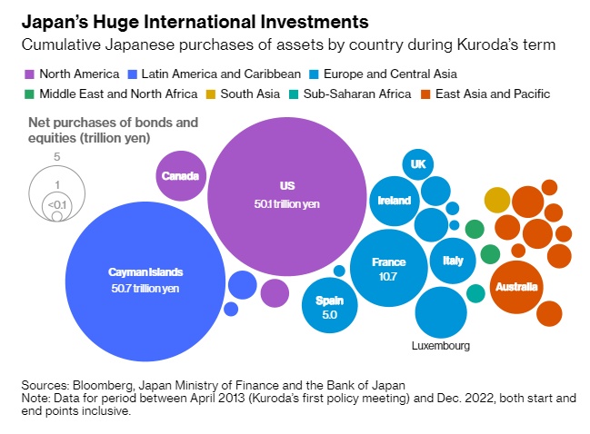 所有这一切都有可能在新行长植田和男的领导下瓦解,在其他地区的利率上升已经在震动国际银行业,并威胁到金融稳定的背景下,这位新任行长可能将结束全球最大胆的宽松货币实验。而如果采取这一举措,其影响将是巨大的:日本投资者是美国政府债券的最大外国持有者,从巴西债务到欧洲发电站,再到美国境内的高风险贷款,日本投资者无所不包。