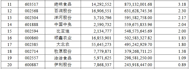 除了此前公布的前十大重仓股外,该基金第十一至二十的重仓股分别为:绝味食品(603517.SH)、百润股份(002568.SZ)、洋河股份(002304.SZ)、中国中免(601888.SH)、比亚迪(002594.SZ)、顺鑫农业(000860.SZ)、大北农(002385.SZ)、牧原股份(002714.SZ)、洽洽食品(002557.SZ)、伊利股份(600887.SH)。除了伊利股份外,其他九只股票公允价值占基金资产净值比例均超1%。