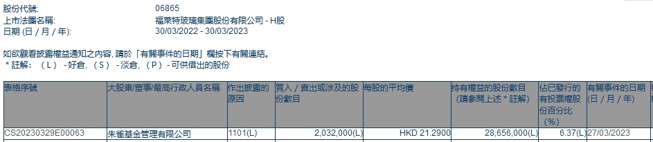 智通财经APP获悉,香港联交所最新资料显示,3月27日,朱雀基金增持福莱特玻璃(06865)203.2万股,每股作价21.29港元,总金额约为4326.13亿港元。增持后最新持股数目为2865.6万股,最新持股比例为6.37%。