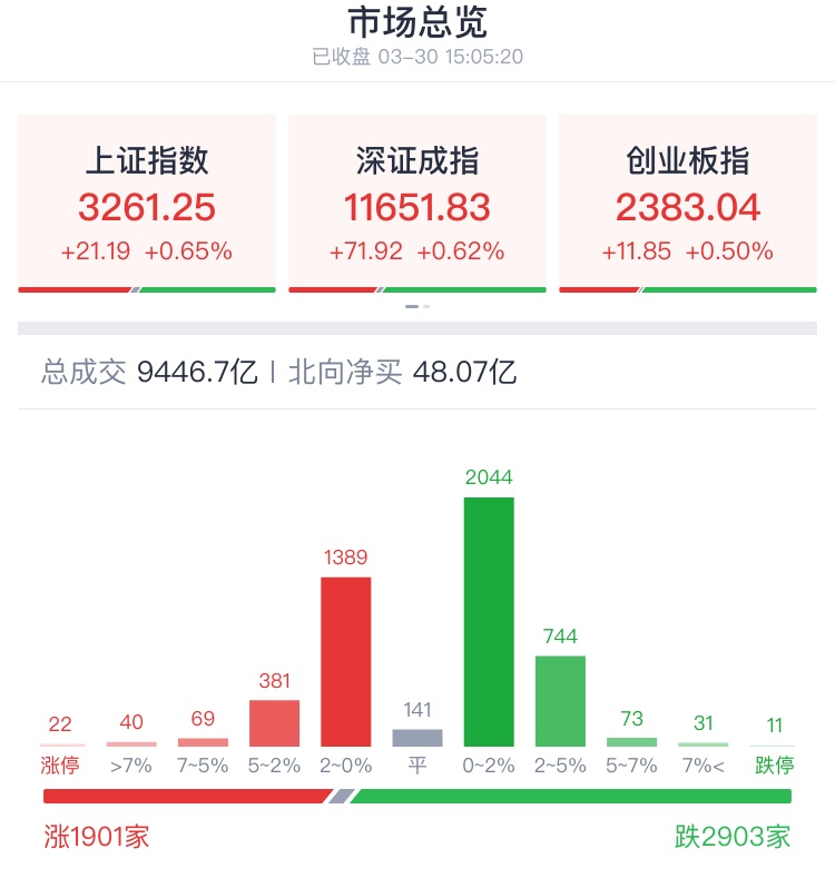 大盘全天探底回升,三大指数均小幅上涨,大消费赛道回归,全聚德涨停!截至收盘,沪指涨0.65%,深成指涨0.62%,创业板指涨0.5%。两市全天成交9447亿,外资净买入48.07亿。